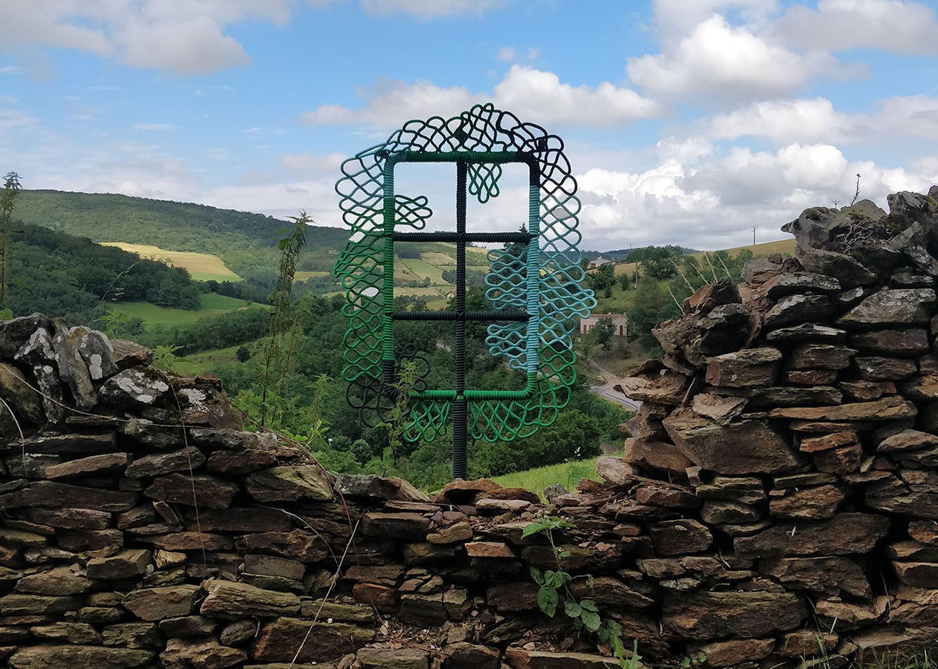 Progressivement, le travail s'est structuré en travaillant à partir de pierres et de cordes locales. La pierre, matériau de construction de la Chartreuse, des murets guidant le visiteur sur le parcours ou encore support de légendes des Roches de Marlin… est l'élément qui nous raccroche au sol, qui accompagne le visiteur au long du parcours et qui devient une clef de compréhension du site.
